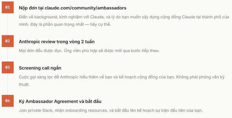 Ai nên apply ngay? Nếu bạn là người đang dùng Claude Code hoặc Cowork hàng ngày, đã từng muốn gặp gỡ những người xây dựng cùng công cụ đó, và có một chút kinh nghiệm kéo người khác cùng tham gia, thì đây là cơ hội tốt hơn hầu hết các chương trình cộng đồng AI mà mình thấy trong năm qua.