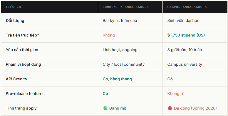 📌 Lưu ý: Chương trình không trả thù lao trực tiếp. Quyền lợi là gián tiếp, API credits, funding sự kiện, networking và access. Nếu bạn cần thu nhập thì đây chưa phải đáp án, nhưng giá trị phi tài chính là rất thực.