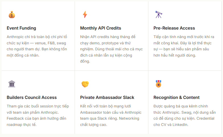 Điểm mình thực sự đánh giá cao: Anthropic không chỉ trao “Badge danh dự”. Họ cho Ambassador pre-release access và Builders Council sessions, tức là bạn thực sự có tiếng nói trong product direction. Đây là điều hiếm các công ty lớn làm thật sự, không phải chỉ nói.