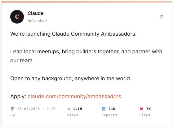 Nói đơn giản hơn: Anthropic đang làm điều mà các công ty lớn như AWS, Figma, Notion đã làm rất thành công, biến người dùng nhiệt tình nhất thành lực lượng marketing và feedback cộng đồng phi tập trung, ở quy mô toàn cầu.
