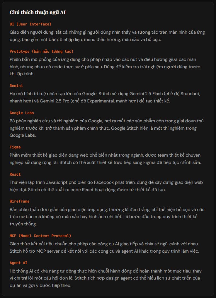 Đối với người làm thiết kế UI chuyên nghiệp, Stitch giúp thoát khỏi trạng thái “trang trắng” khi bắt đầu dự án mới. Thay vì mất hàng giờ để xây dựng wireframe đầu tiên, bạn có thể dùng Stitch tạo ra nhiều hướng ý tưởng trong vài phút, sau đó nhập sang Figma để tiếp tục hoàn thiện theo tiêu chuẩn nghề nghiệp. Đây là cách sử dụng AI để tăng tốc giai đoạn khám phá ý tưởng, không phải để thay thế quy trình thiết kế chi tiết.