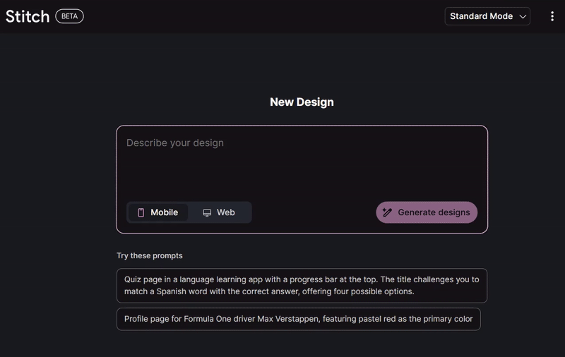 Cho ra kết quả chất lượng cao hơn, chi tiết hơn. Hỗ trợ đầu vào là hình ảnh, tức là bạn có thể upload ảnh chụp và Stitch sẽ tạo thiết kế dựa trên đó. Thời gian xử lý lâu hơn nhưng kết quả tinh tế hơn.