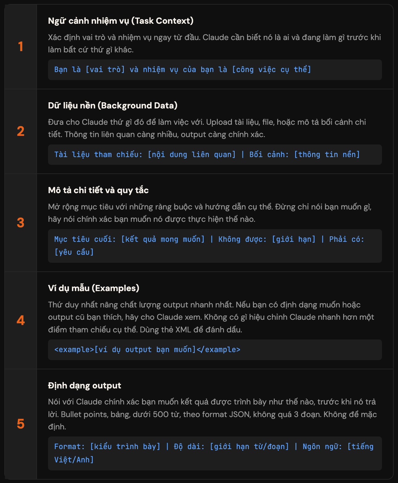 Mình chắt lọc lại 5 thành phần cốt lõi, không thể thiếu, dù cho prompt đó ngắn hay dài.