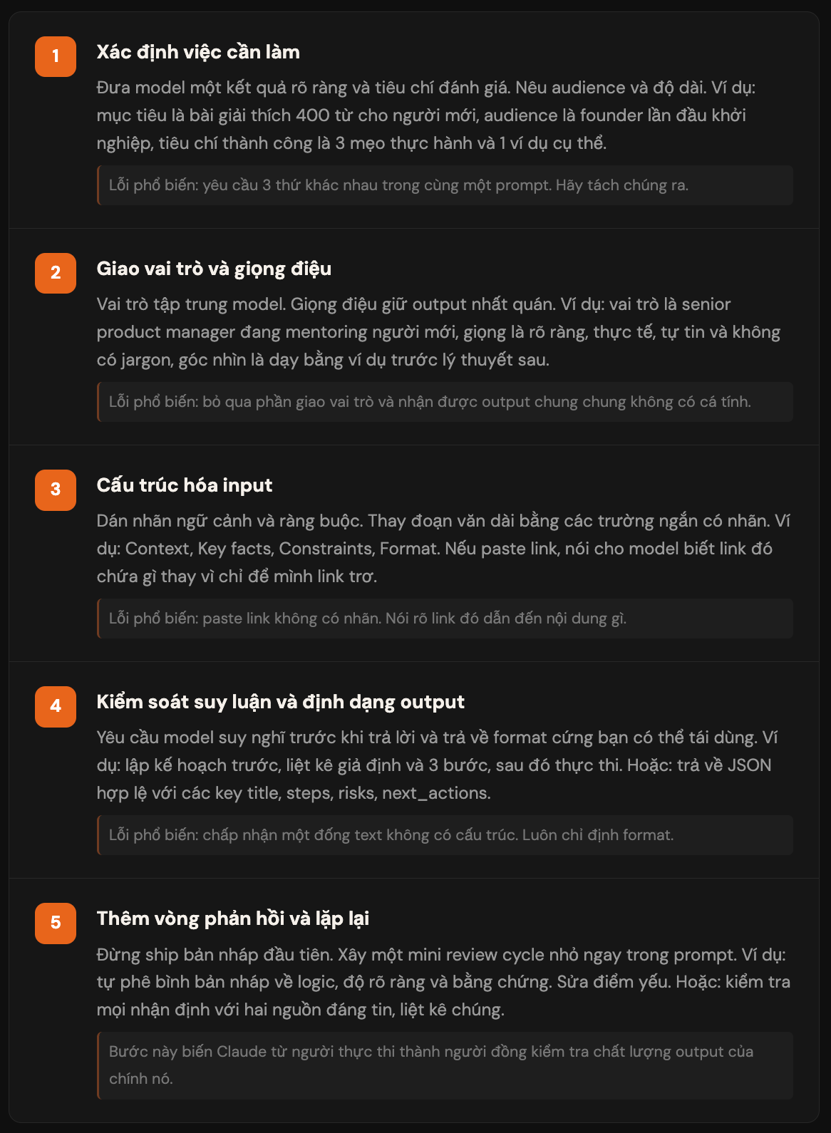 Phản hồi hiệu quả: “Đoạn 3 yếu. Mở rộng với ví dụ cụ thể.” / “Cắt hết những gì nghe như tư vấn viết.”Trở thành Prompt Engineering trong 5 bước
