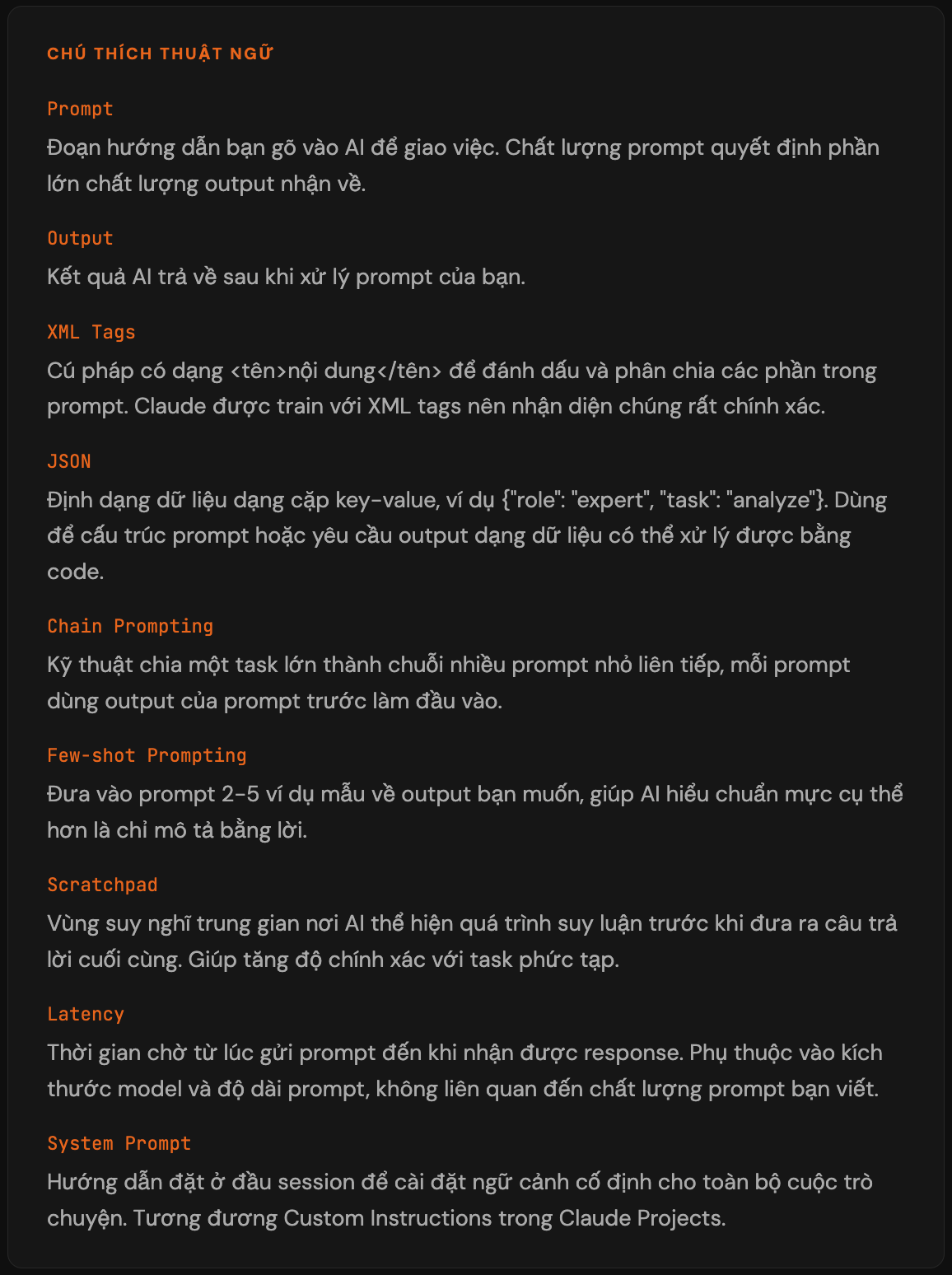 Còn XML tags, JSON format, chain prompting và những thứ kĩ thuật khác là những thứ nên thêm vào khi bạn đã có thói quen Prompt AI tốt rồi. Không phải thứ ưu tiên hàng đầu.