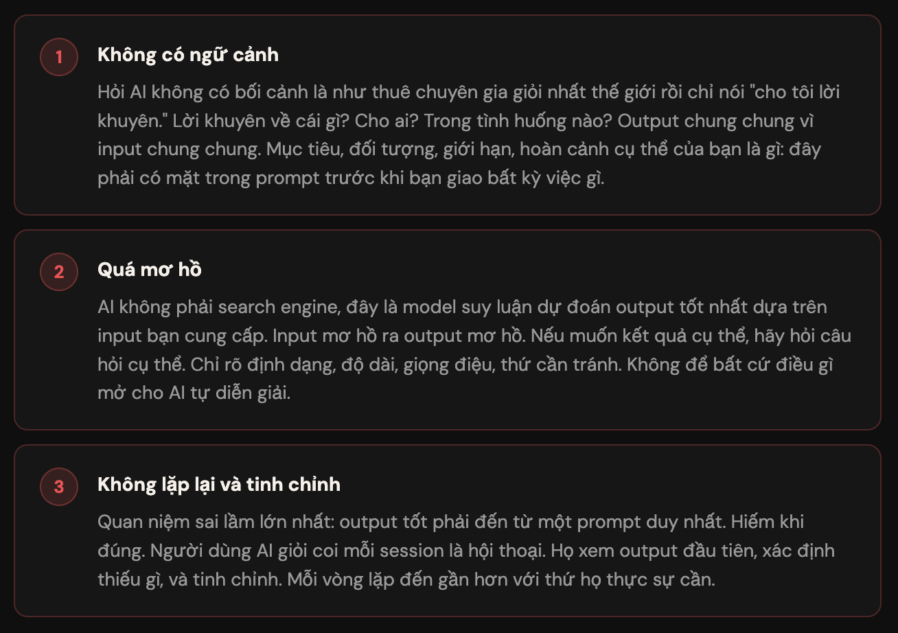 Vấn đề là 95% người dùng AI đang giao tiếp với model AI đó như thể bạn đang tìm kiếm trên Google Search: Ngắn ngủn, không có bối cảnh. Để rồi, nhận về kết quả không mong muốn: Chung chung, nhàm chán, nhiều khi nó còn bịa “bậy bạ” nữa.