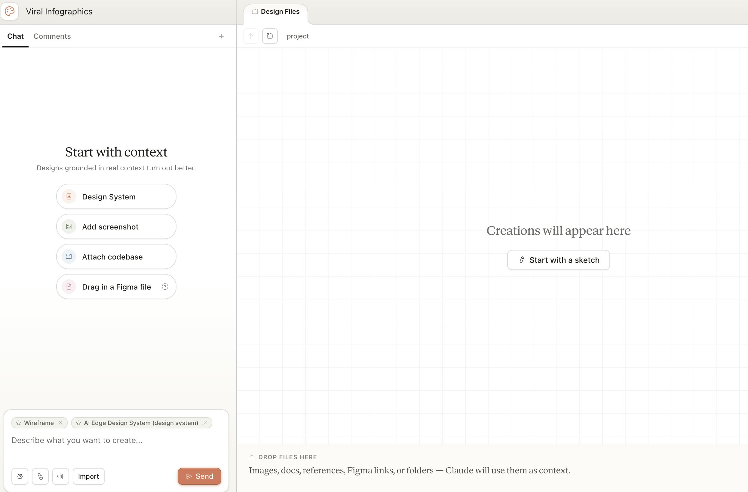 Khi đã vào trong Design Project, bạn có thể bắt đầu từ scratch với natural prompts hoặc add context bằng cách import data, Figma files, codebases, screenshots, và nhiều thứ khác.
