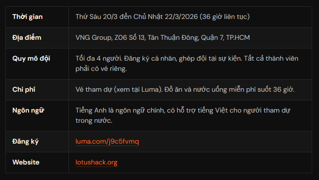 Sự kiện diễn ra 20-22 tháng 3, 2026 tại VNG Group, Quận 7, TP.HCM. Còn 4 ngày. Đăng ký ngay tại Luma