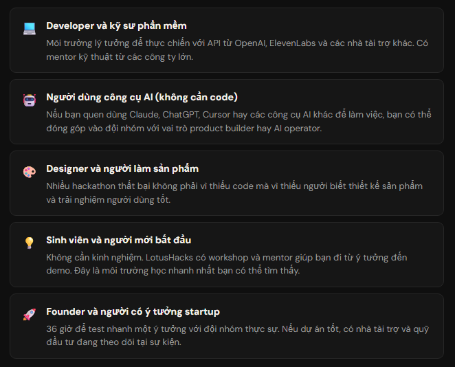 Điểm mình muốn nhấn mạnh nhất là LotusHacks không chỉ dành cho lập trình viên. Đây là điểm khác biệt quan trọng so với hầu hết hackathon truyền thống.