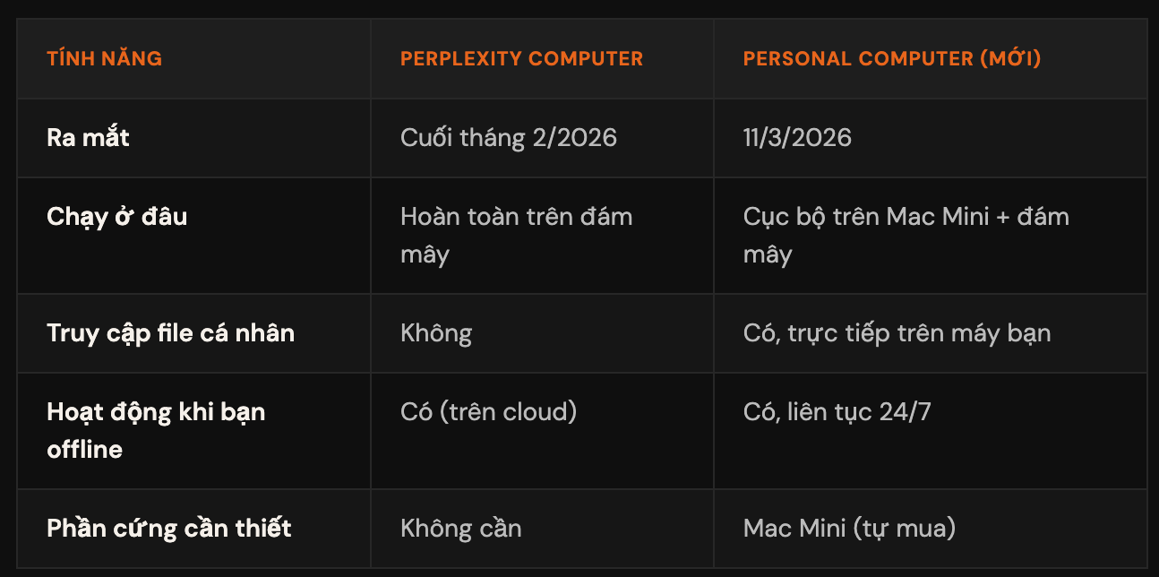 Personal Computer về bản chất là phiên bản mạnh hơn, cá nhân hơn, và sâu hơn của Perplexity Computer, nhờ có thể truy cập trực tiếp vào máy tính của bạn.