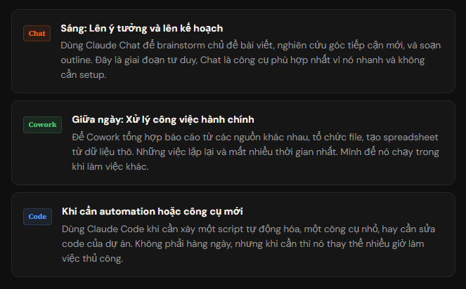 Claude Cowork là thứ mình nghĩ đang bị underrated nhất trong ba. Phần lớn người vẫn chưa thử vì nó mới, cần cài Desktop app, và khái niệm “AI hành động trong máy tính của mình” vẫn còn nghe xa lạ. Nhưng một khi đã setup xong và chạy được task đầu tiên, cảm giác để AI tự làm một việc mà trước đây mất 45 phút, lần đầu thực sự không giống bất kỳ thứ gì khác.