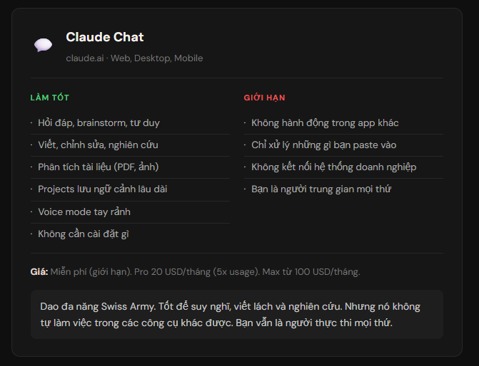 Claude Chat là công cụ tư duy tốt nhất mình từng dùng. Không phải vì nó thông minh hơn các AI khác ở mọi thứ, mà vì nó viết dài và đi sâu tốt hơn. Projects giúp duy trì ngữ cảnh qua nhiều session. Research Mode tìm kiếm và tổng hợp tốt hơn mình làm thủ công.