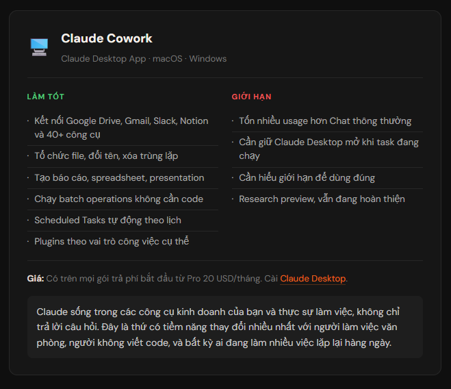 Điểm trừ thực tế cần lưu ý: Cowork vẫn ở dạng research preview và tiêu thụ nhiều usage hơn Chat. Với gói Pro 20 USD/tháng, bạn sẽ cảm thấy giới hạn nếu dùng nặng. Gói Max 100 USD/tháng phù hợp hơn nếu định dùng Cowork thường xuyên.