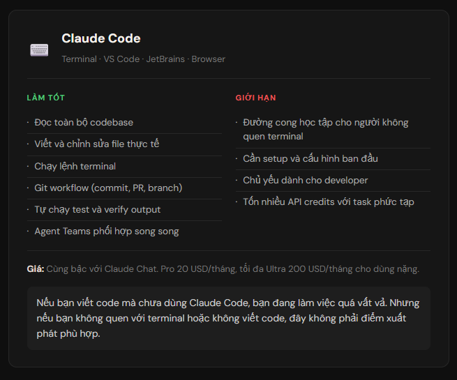 Claude Code là thứ mình chỉ dùng một phần trong công việc nhưng thấy tác động rõ ràng. Không cần biết code giỏi để bắt đầu, nhưng cần quen với terminal ít nhất ở mức cơ bản.