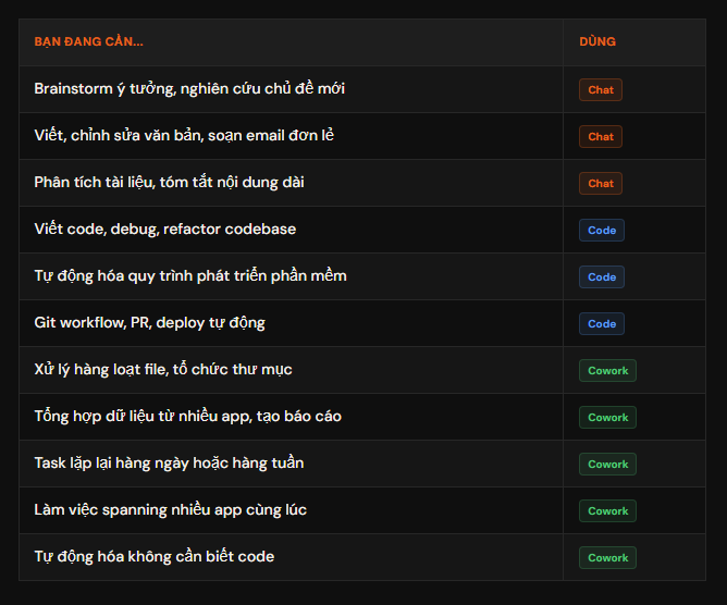 Nếu Claude Chat là AI trả lời câu hỏi của bạn và Claude Code là AI viết code cho developer, thì Cowork là thứ gì đó khác hẳn về bản chất: