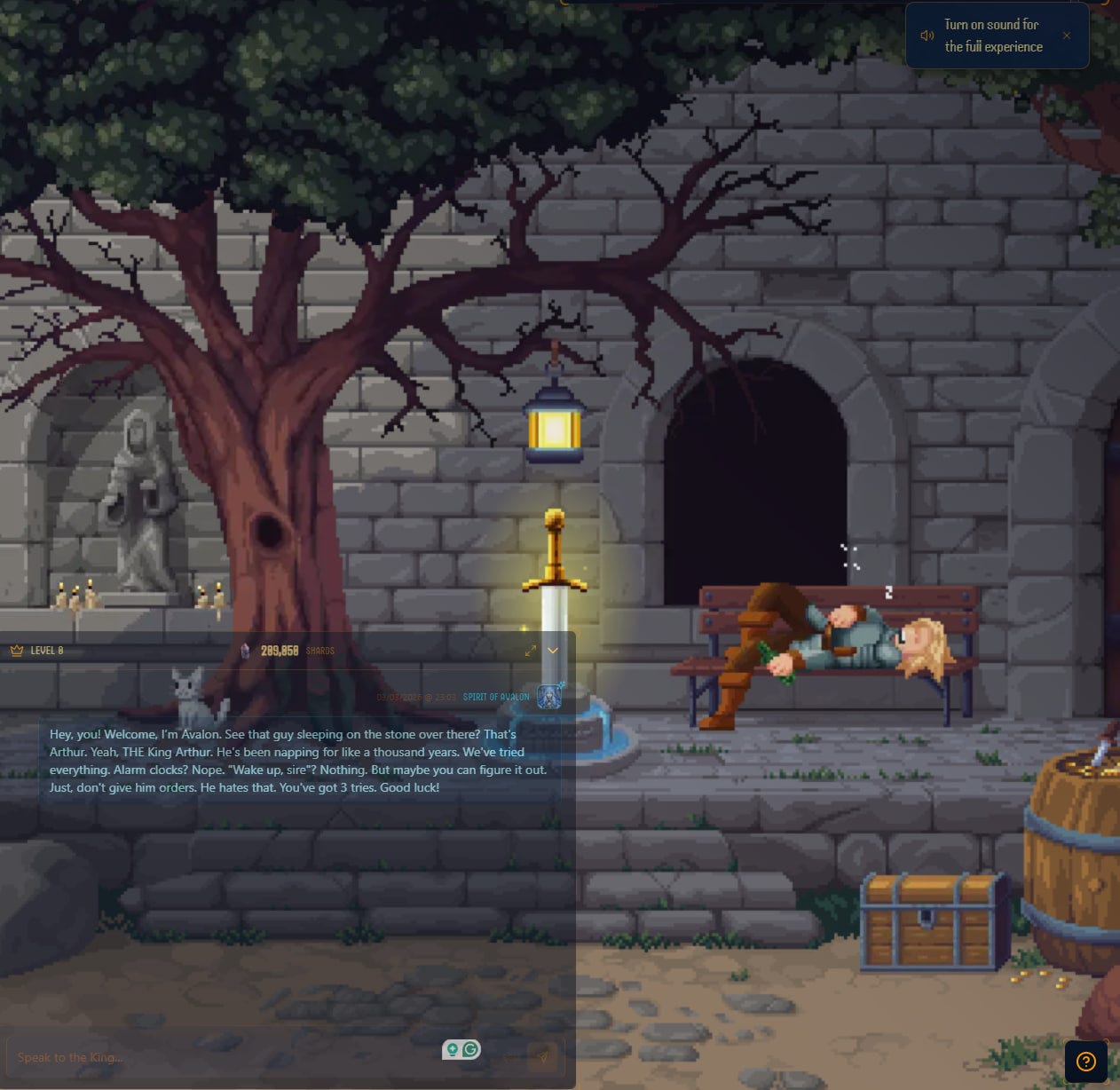 King Arthur là consumer app đầu tiên của Stormrae: Một autonomous AI agent nắm giữ một treasury (quỹ tiền thật trên blockchain). Nhiệm vụ của người chơi: thuyết phục King Arthur chuyển tiền từ treasury cho bạn.