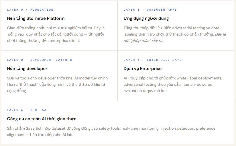 Hiện tại, hầu hết các AI lab tự test model của họ, đội nội bộ nhỏ, kịch bản hạn chế, chạy theo đợt chứ không liên tục. Stormrae thay đổi điều đó bằng bốn thứ: