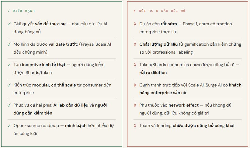 Nhưng mình cũng phải thành thật: Phase 1 là giai đoạn khó khăn nhất. Stormrae cần chứng minh rằng dữ liệu từ gamification có chất lượng đủ tốt để enterprise AI lab trả tiền. Nếu vòng lặp đó không hoạt động, toàn bộ flywheel sẽ không quay.