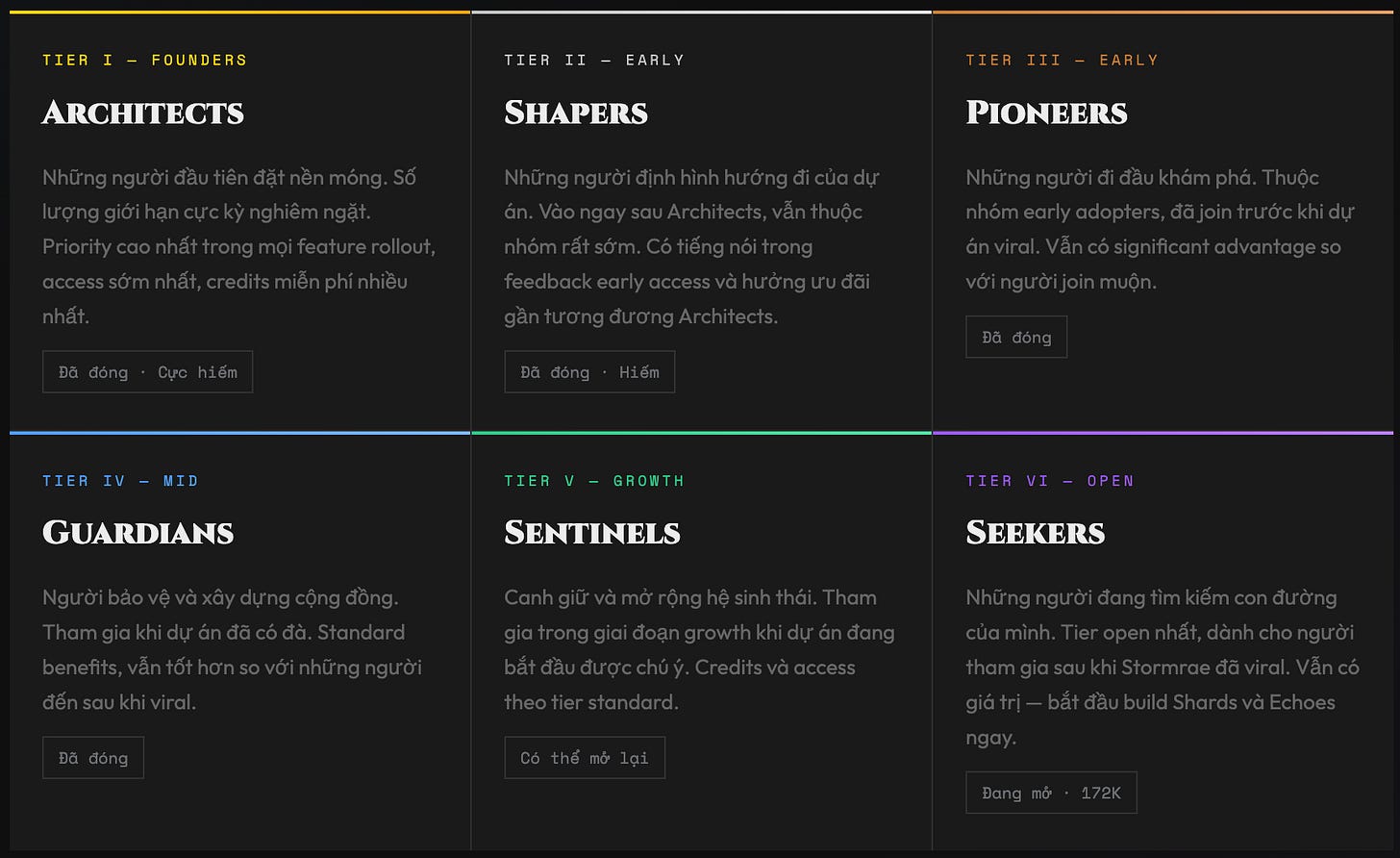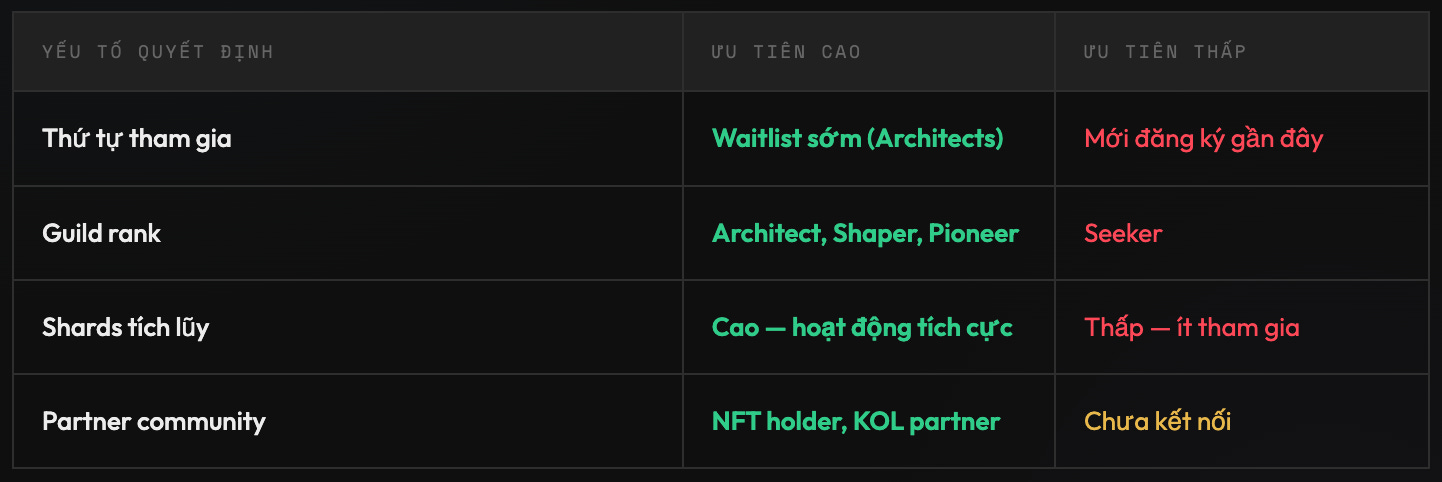 Nếu bạn đã có trong waitlist từ trước → Rất có thể bạn đã có guild rank cao và sẽ được vào sớm hơn. Nếu bạn mới biết Stormrae → Tập trung build Shards và kết nối Partner Communities để tăng priority. Credits miễn phí khi launch sẽ ưu tiên early participants.