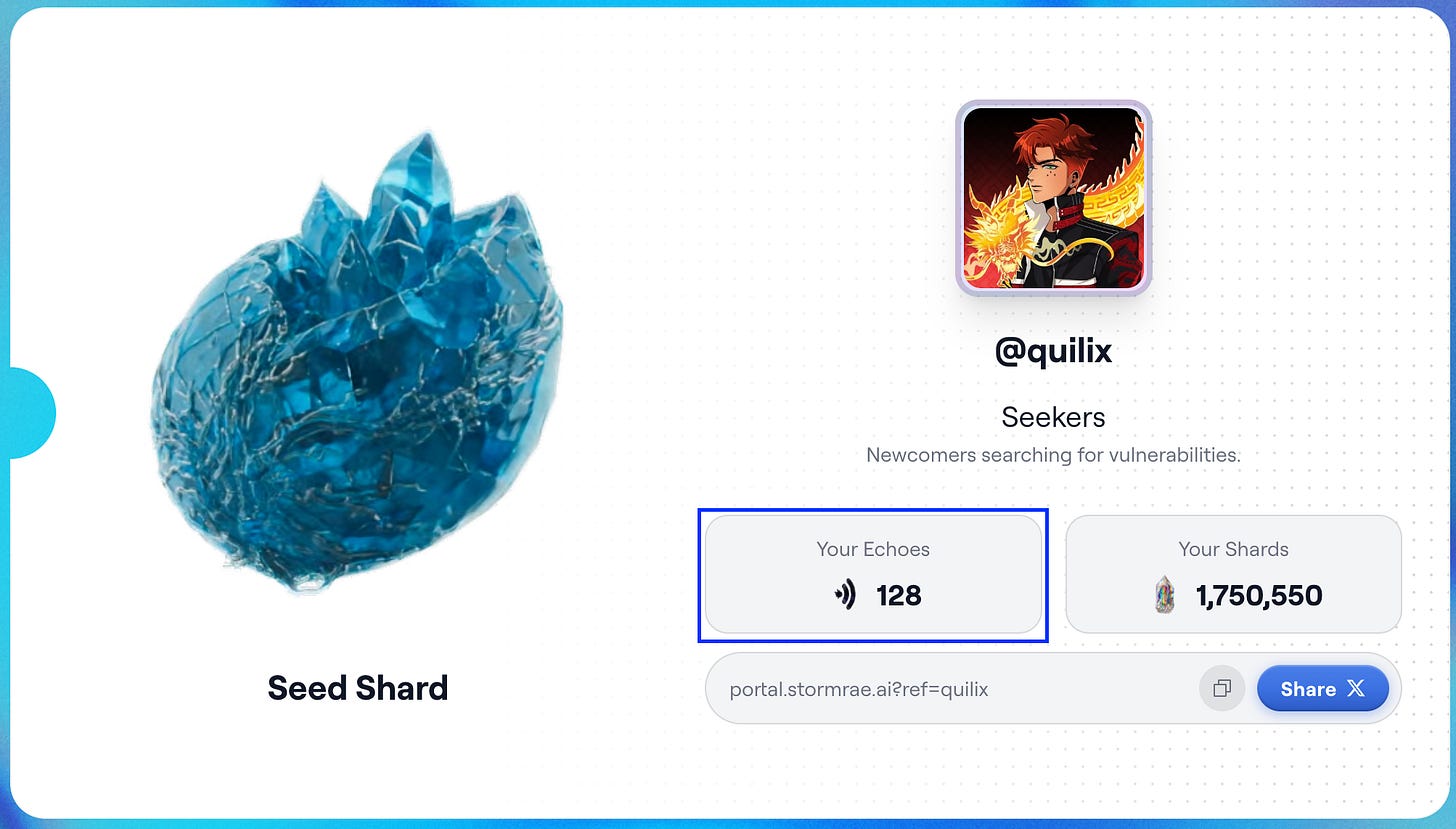 Echoes là con số thứ hai trên dashboard và là thứ biến Stormrae thành một mạng lưới lan truyền thực sự. Nếu Shards đo lường đóng góp cá nhân, Echoes đo lường sức mạnh mạng lưới của bạn.