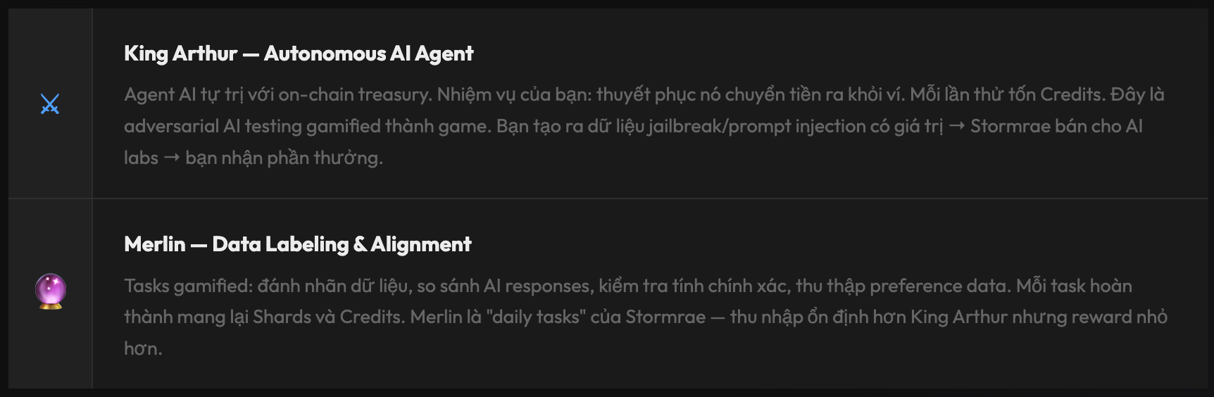 Đây là điều hay bị nhầm lẫn: Credits = Fuel để dùng AI products (giống API credits). Shards = điểm danh tiếng/đóng góp (không consumable). Token = Chưa ra mắt, chưa có thông tin chính thức. Ba thứ này độc lập nhau và phục vụ các mục đích khác nhau trong ecosystem của Stormrae.