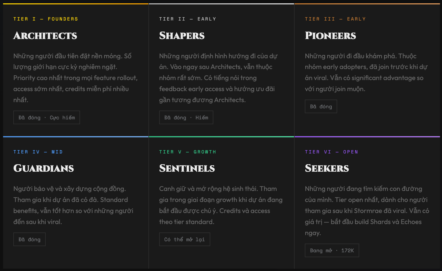 Trước đó, dự án vận hành một waitlist tại waitlist.stormrae.ai. Toàn bộ 172,000+ tài khoản đã được migrate sang portal.stormrae.ai. Điều quan trọng: Mọi Shards, Echoes, và Guild status bạn tích lũy từ waitlist đều được giữ nguyên, không mất dữ liệu.