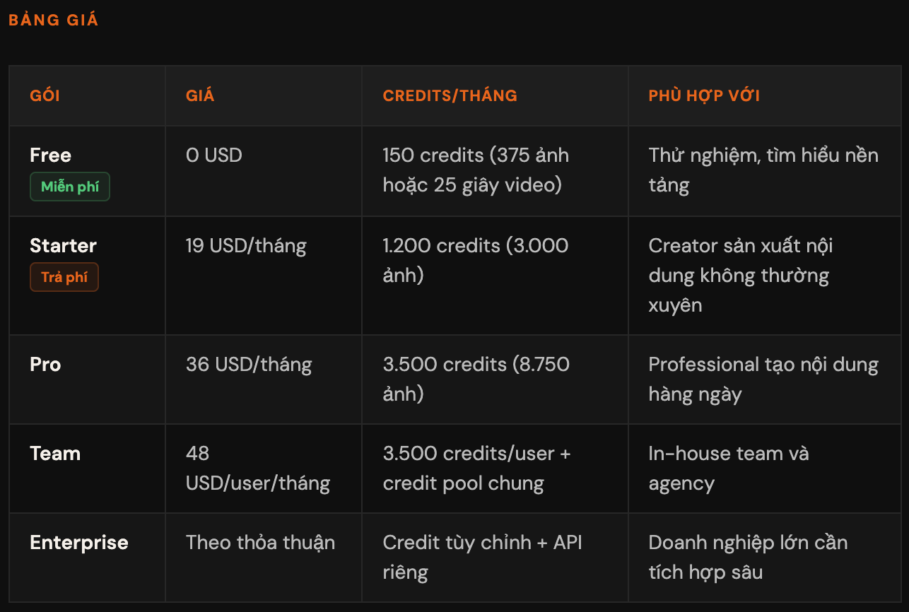 Weavy dùng hệ thống "credit" để tính phí. Mỗi lần tạo ảnh hoặc video sẽ tốn một số credit nhất định, tùy vào mô hình AI mà bạn chọn.