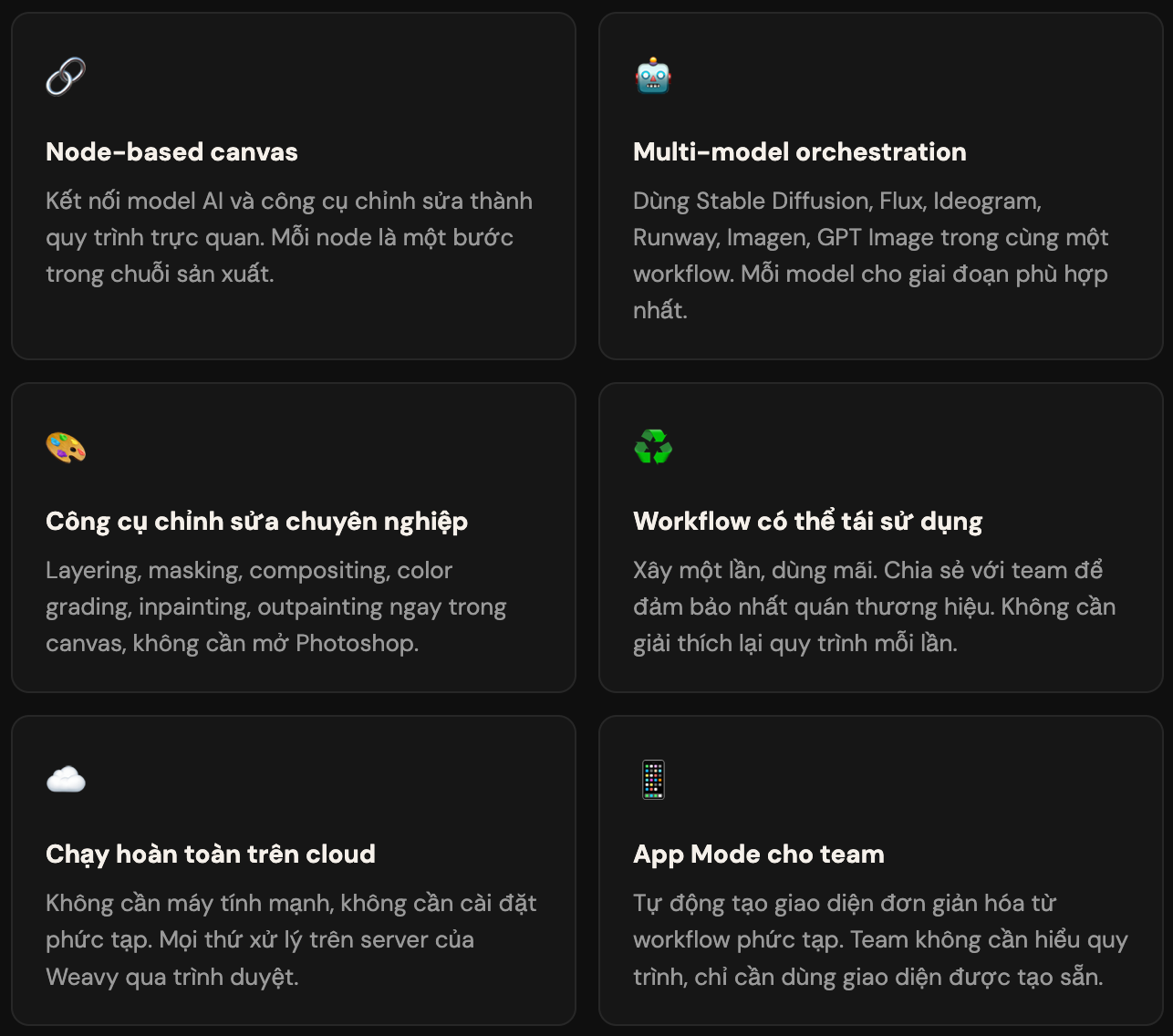 Đội ngũ của Weavy gọi triết lý này là “Artistic Intelligence”: AI không thay thế bạn tạo sản phẩm, mà là hệ thống bạn tự thiết kế và điều khiển để cho ra kết quả hợp lý.